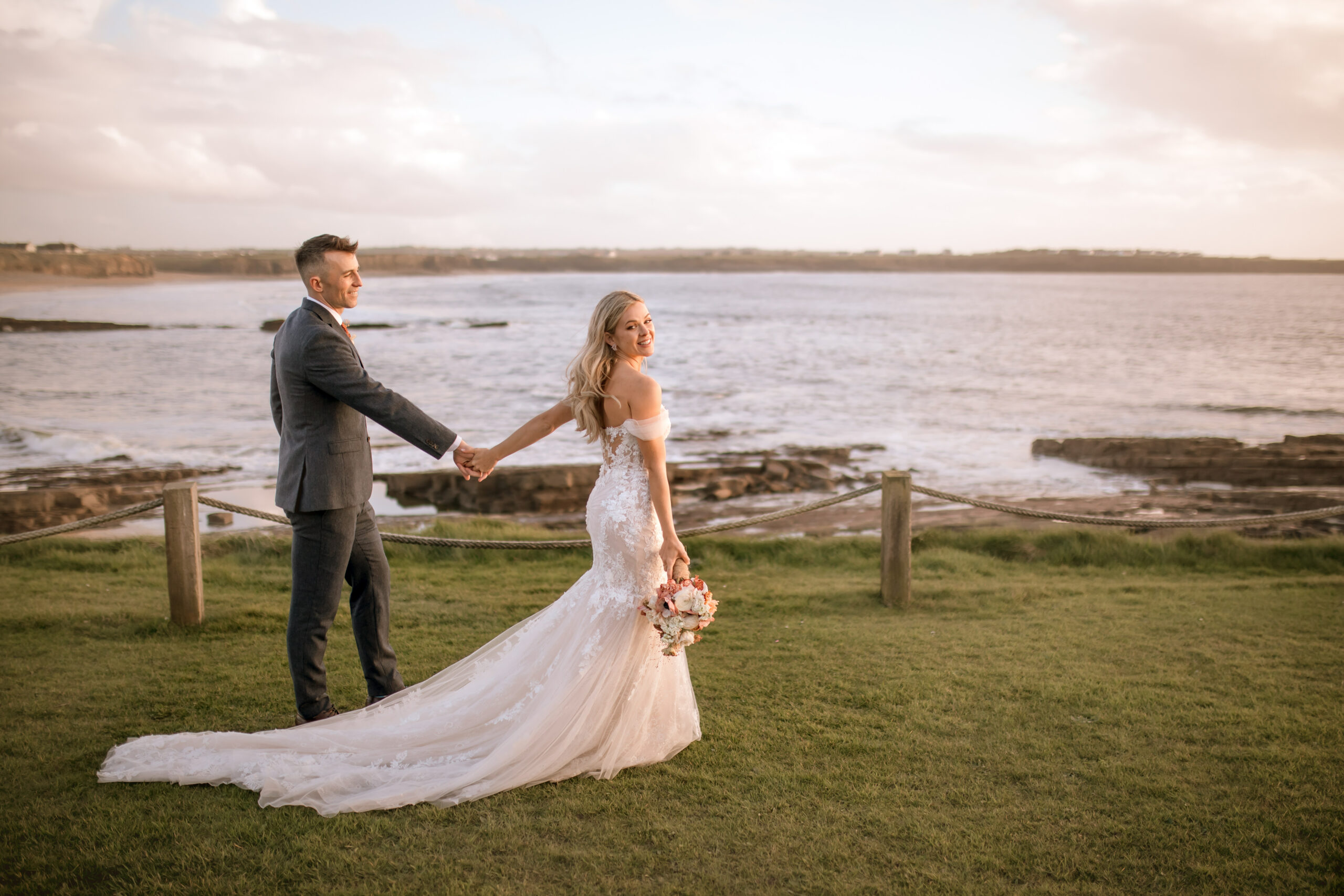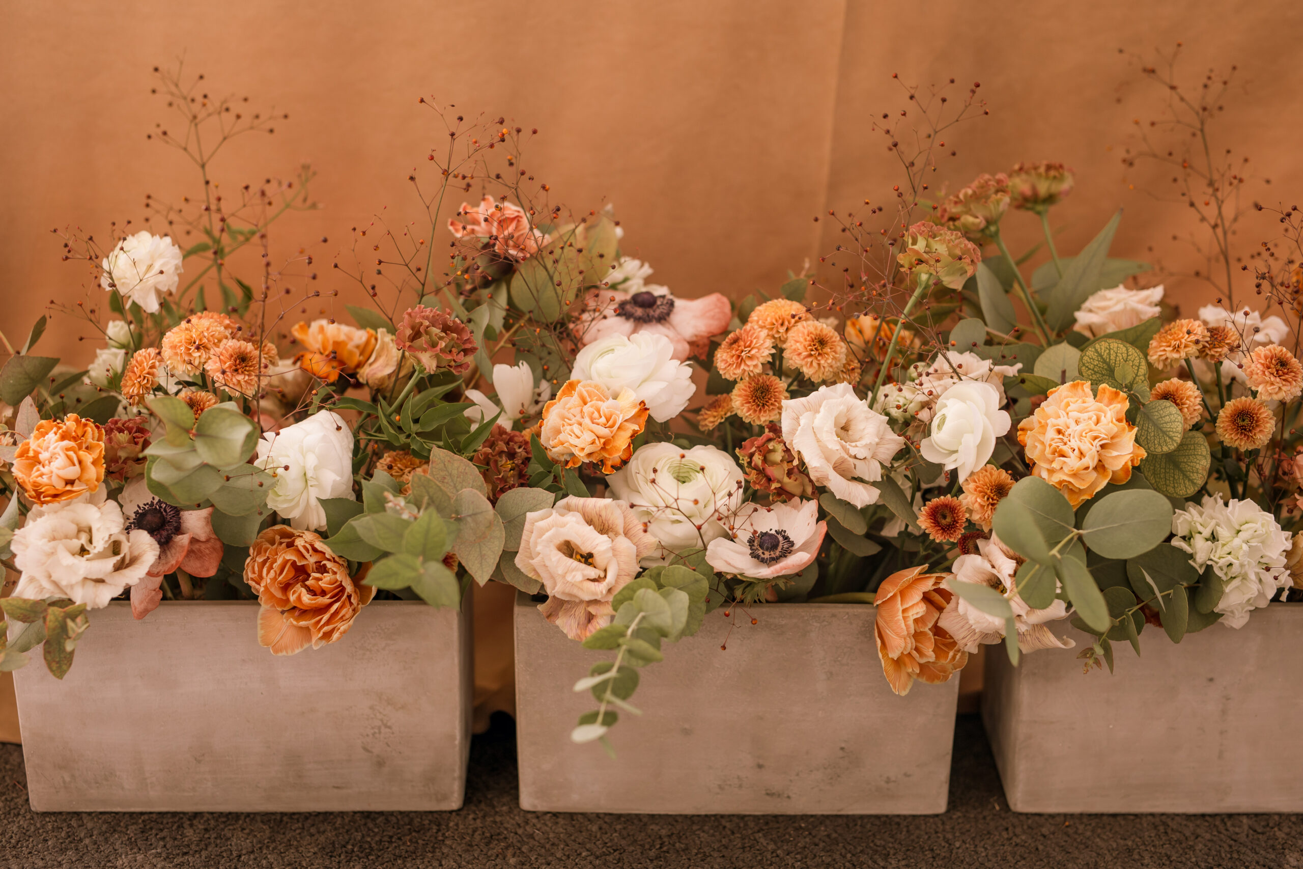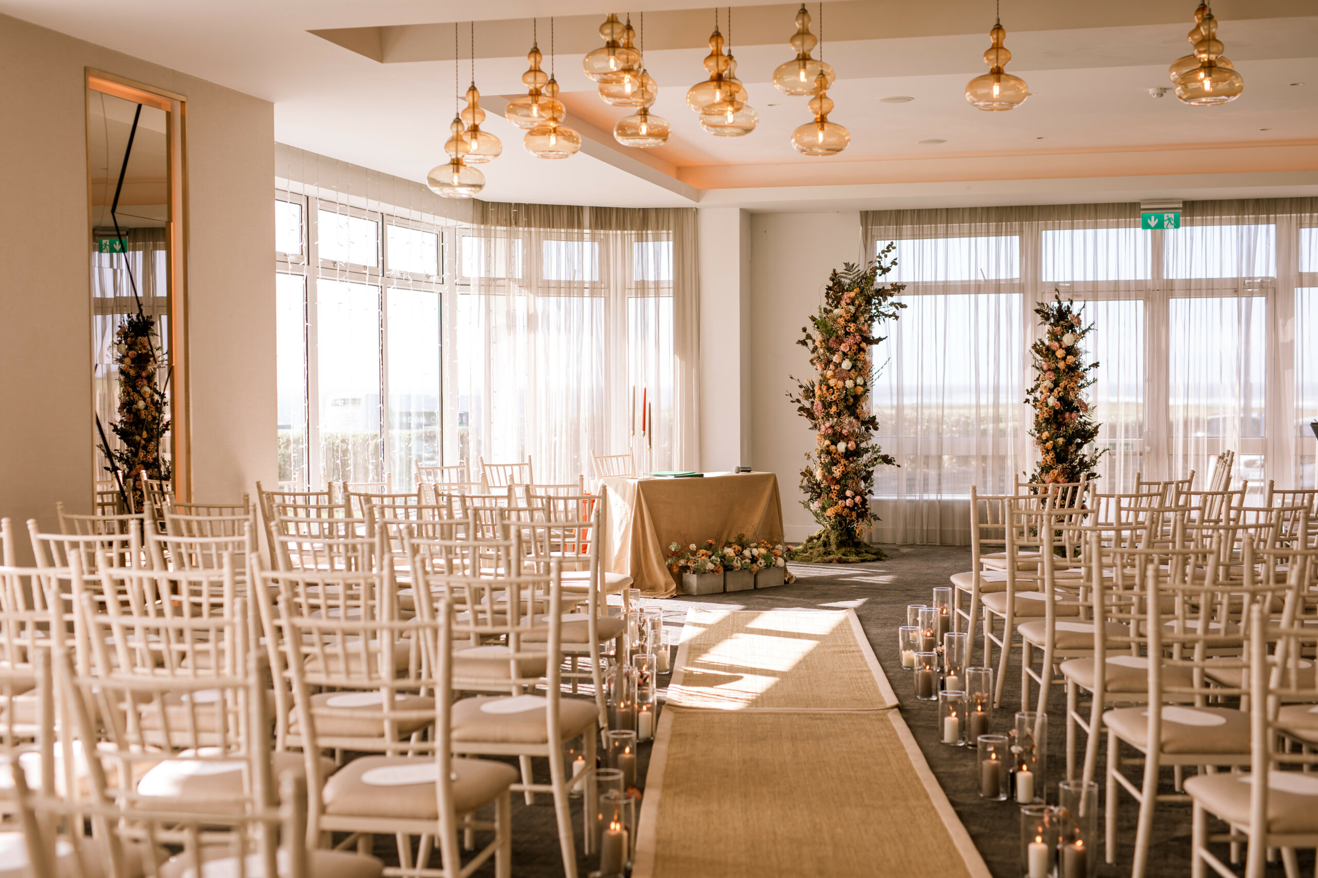 A gorgeous alternative colour palette in the stunning surrounds of the Armada Hotel in Spanish Point. A deconstructed arch full of tones and texture made for a statement ceremony backdrop, featuring the most beautiful carnations, chrysanthemums and ranunculus. The wedding of Flynn & Cathal was a magnificent example of what you can achieve when you look beyond a regular colour palette